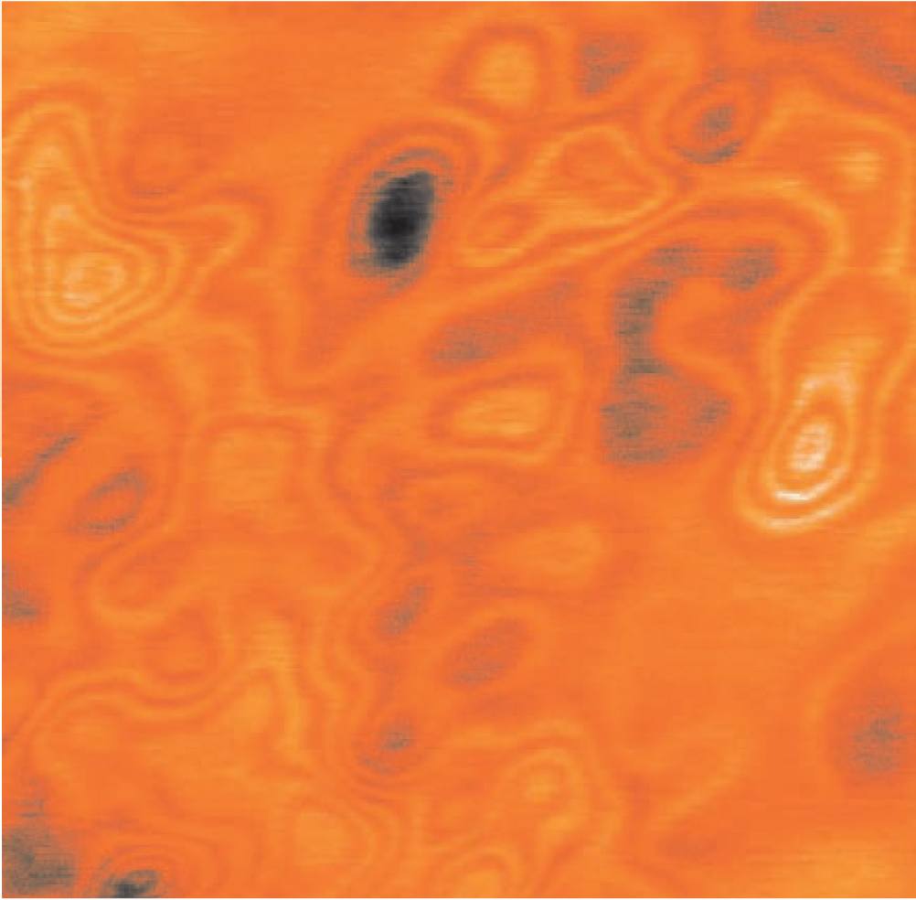 Figure 2. Subsurface charge accumulation in a two-dimensional electron gas maps the electrostatic potential experienced by the 2DEG in the quantum Hall regime with a filling factor ν = 1. A positive voltage on the tip of a scanning tunneling microscope above the sample pulls in electrons to create a few-electron bubble in the 2DEG. The closed contours in this 2.5 × 2.5-µm2 image are caused by the quantization of electronic charge inside the bubble: The contours, which arise as individual electrons move in and out of the bubble, surround high and low regions of the random electrostatic potential.