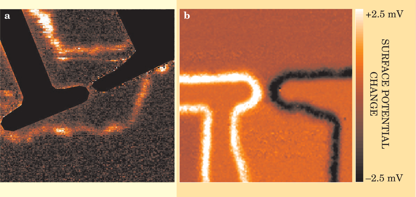 Figure 3. Imaging with a single-electron transistor. (a) Edge states form along the boundaries of a two-dimensional electron gas in the quantum Hall regime. The bright strips in this 15 × 15-µm2 image are incompressible regions of the electron gas next to the edge state for a filling factor ν = 2. The incompressible regions allow the electric field from an electrode beneath the 2DEG to reach the SET. (Negative voltage applied to the two black gate electrodes has closed the constriction between them.) (b) The SET probe can also detect changes in potential. A current flowing through an open aperture between the electrodes generates a transverse Hall potential that appears along the edges of the electrodes. No longitudinal potential is apparent at the top and bottom of this 7 × 7-µm2 image.