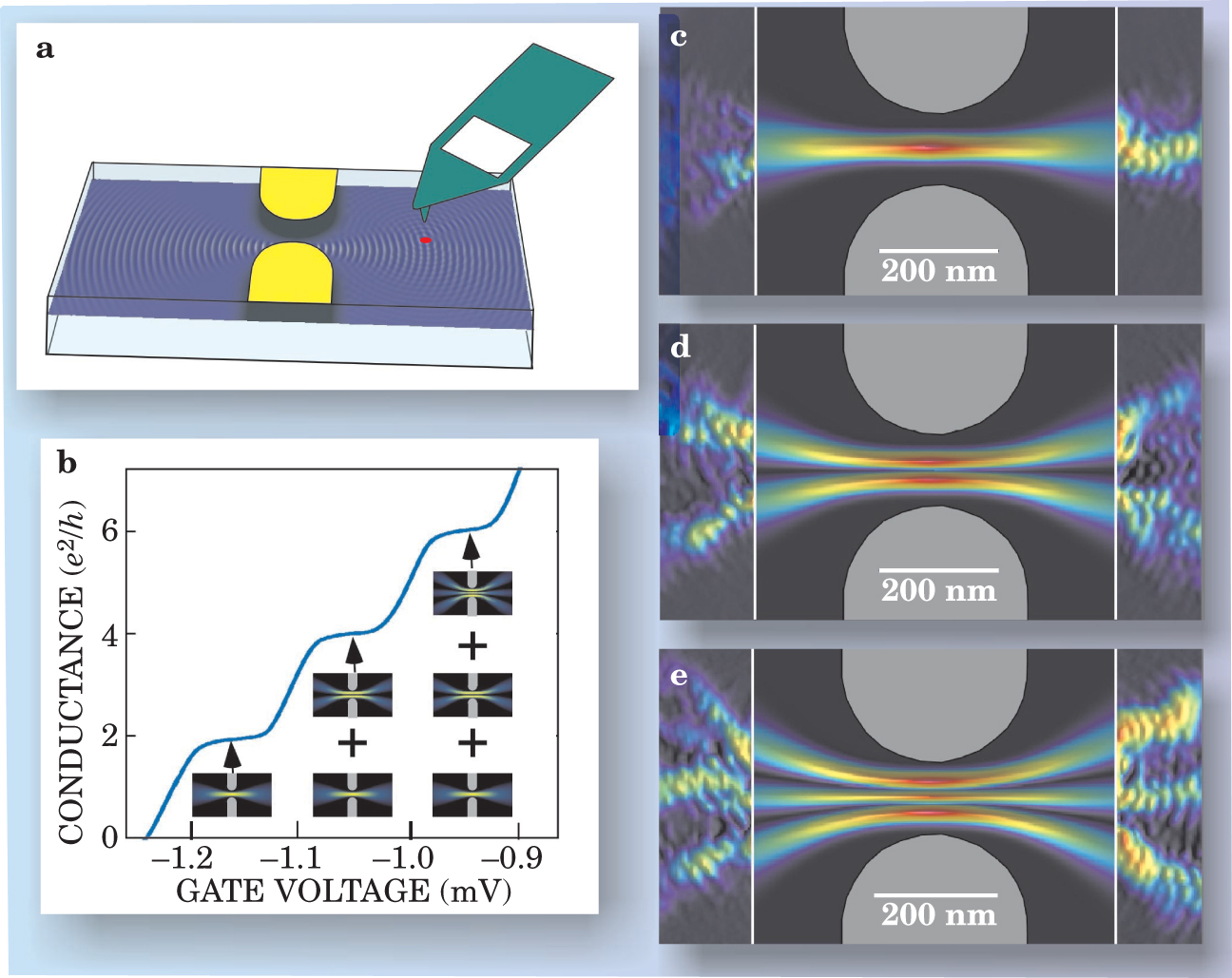 Figure 4. Electron flow through a quantum point contact. (a) Scheme for imaging current flow through a QPC using scanning probe microscopy. Two gate electrodes (yellow) create a narrow constriction in the underlying two-dimensional electron gas. A charged tip (green) depletes the electron gas below it, creating a divot (red spot) that scatters incoming electron waves, as shown in the simulations (blue). (b) The conductance of the QPC, measured at 1.7 K, increases in quantized steps as the gate voltage (and QPC width) is increased. The insets below each step show simulations of the spatial pattern of electron flow for the transverse modes that contribute to the conductance. (c–e) Experimental images of electron flow at 1.7 K (left and right) and theoretical simulations (center) for the first three transverse modes of a QPC. The observed interference fringes spaced by half the Fermi wavelength demonstrate the coherence of electron flow. Because the additional flow, appearing as the QPC becomes wider, is due to the newly opened-up mode, the image for each transverse mode could be obtained by subtracting the raw images from the next lower step.