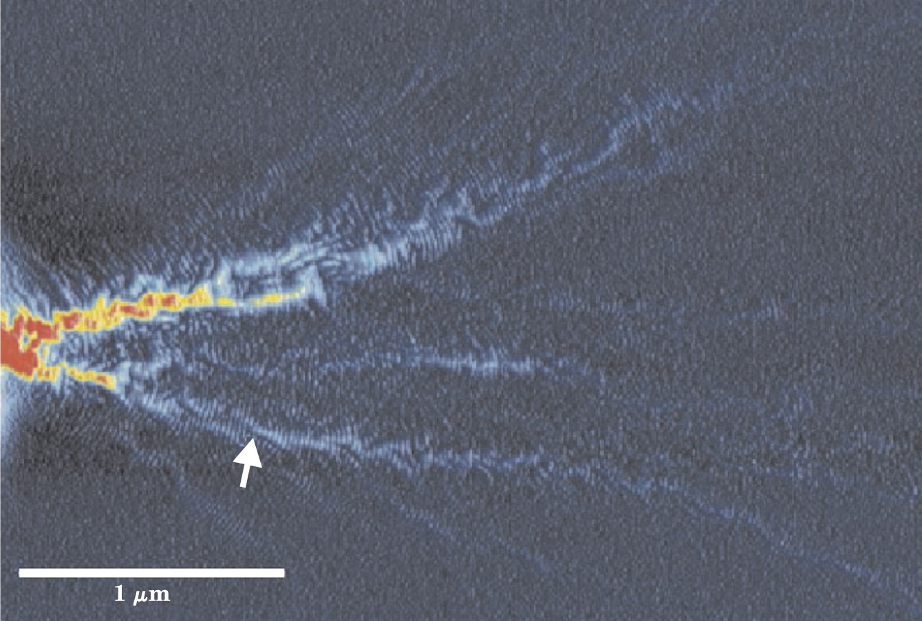 Figure 5. Electron flow through a two-dimensional electron gas from a quantum point contact on the first conductance step. The image shows surprisingly narrow branches that are produced by small-angle scattering from charged donor atoms in the donor layer, as shown in figure 1. The interference fringes, demonstrating quantum mechanical coherence, extend throughout the image. The arrow points to a cusp produced by the focusing effect of a nearby impurity atom.