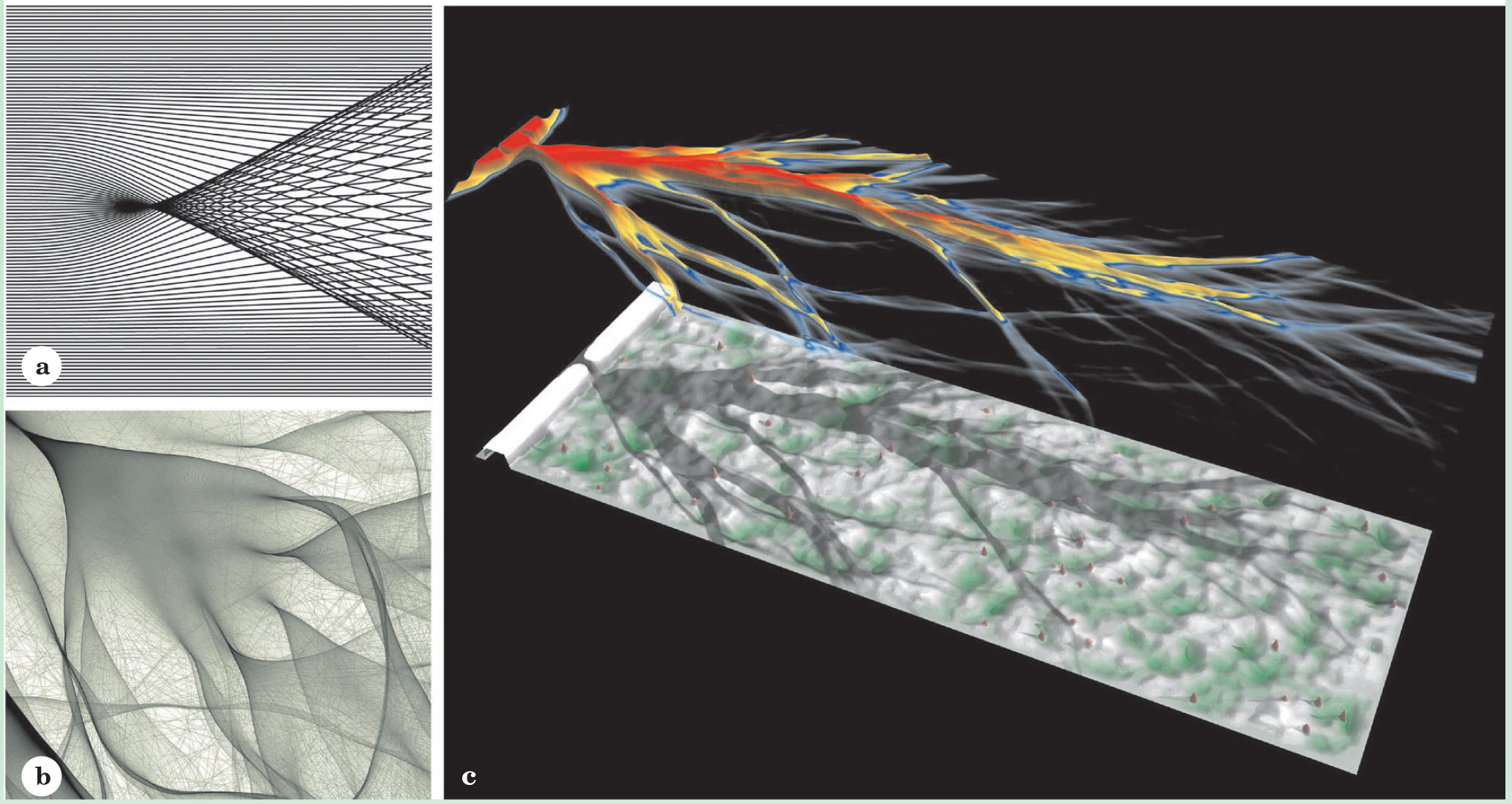 Figure 6. Simulations of electron flow. (a) Parallel electron trajectories, going from left to right, form a V-shaped cusp due to focusing by a potential-energy dip caused by a charged donor atom (not seen) above a two-dimensional electron gas. (b) A realistic 2DEG simulation that includes many ionized donors forms several generations of cusps. The electrons travel here from upper left to lower right. (c) Ray-tracing simulations of electron flux emerging from a small opening into a region of random potential reflect the features seen in experimental images of 2DEG quantum point contact samples. The potential is shown green in the valleys and white on the peaks. The electron flux is coded by height and color, with blue corresponding to regions of low flux; still lower flux is transparent. The “shadow” of the flux on the potential plot shows where the flux lies relative to the hills and valleys; no guiding valleys are seen. A slight change of the position of the opening changes the location and direction of the branches.