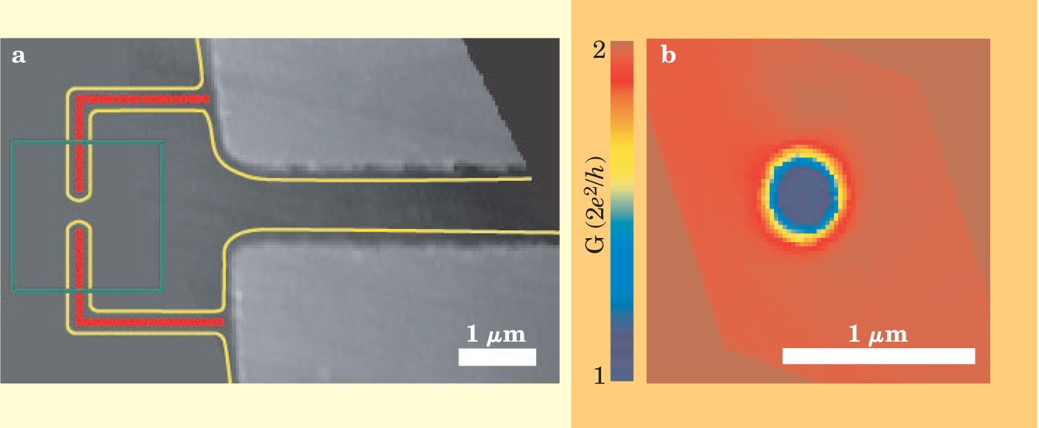 Figure 7. Erasable electrostatic lithography can fabricate customized two-dimensional electron gas devices. (a) A scanning probe microscope tip held at a negative voltage has deposited dots of charge (red) on the surface above a 2DEG. The deposited charges, along with fabricated electrodes (gray), define the walls of the 2DEG structure (yellow). (b) As the charged SPM tip is scanned above the area outlined in green in panel (a), the conductance of the 2DEG shows a dip when the tip is over the quantum point contact defined by the deposited charge.