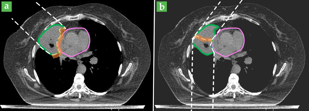 Figure 1. For a lung tumor (outlined in green) abutting the heart (pink), the ideal treatment plan (a) would use a single proton beam (outlined by dashed white lines) that stops at the deepest edge of the tumor. Due to the beam-range uncertainty, however, a margin (orange shaded area) must be added to the treatment area targeted for the full prescribed radiation dose. The end of the beam range is thus inside the heart, which may suffer severe damage or functional complications. To avoid such risk to critical organs, a suboptimal plan (b) with two beams might be used instead, even though it now delivers a low to intermediate radiation dose to the healthy lung.