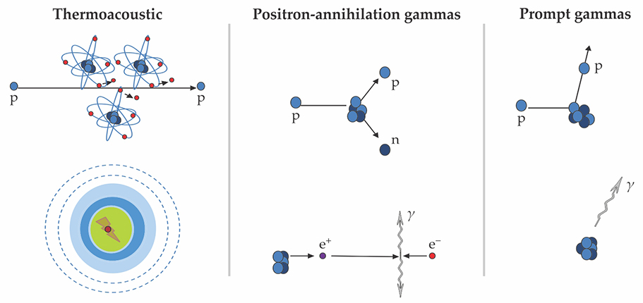 Figure 2. Three types of secondary emission occur when a proton or ion treatment beam interacts with tissue. In thermoacoustic emission, the particle beam interacts with atomic electrons, as shown in the top panel, and locally heats the tissue to create a pressure wave, as shown in the bottom panel. Positron-annihilation gammas are created through inelastic nuclear interactions that leave behind positron-emitting isotopes; each emitted positron annihilates with an electron to produce two 511-keV gamma rays. Prompt gammas are produced when nuclear scatter events promote tissue nuclei to excited states that decay through the emission of single gammas, whose energies depend on the element involved.
