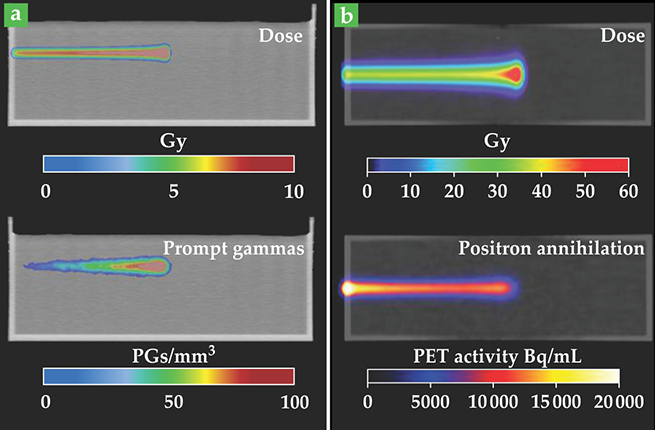 Figure 4. Simulated patients—tanks of water or gelatin—are irradiated with proton beams for proof-of-principle gamma imaging. In each case, the dose distribution in the upper panel is calculated, and the gamma distribution in the lower panel is measured. (a) A 150-MeV clinical proton pencil beam impinges on a water tank, and the prompt-gamma (PG) emission is imaged with an experimental Compton camera specially designed for the purpose. (b) Positron-annihilation gamma emission from a tank of tissue-like gelatin is imaged with a commercial diagnostic positron emission tomography instrument shortly after irradiation with a 177-MeV proton beam. The strong signal near the entrance region in the PET image is a result of carbon-11 activation in the carbon-rich walls of the tank. (Panel b courtesy of Julia Bauer, Heidelberg Ion-Beam Therapy Center.)
