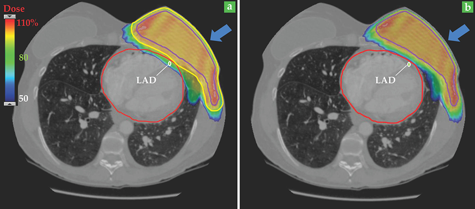 Figure 5. Patient outcomes can be greatly improved by in vivo imaging that reduces beam-range uncertainty by just a few millimeters. In this breast cancer patient, the intended treatment volume is indicated by the purple line, and the direction of the treatment beam is shown by the blue arrow. (a) To account for the beam-range uncertainty, the treatment volume must be expanded to the region enclosed in yellow. As a result, significant dose (shown here as a percentage of the prescribed dose) is delivered to the heart (red line) and the left anterior descending coronary artery (LAD; white line). (b) With range-verified proton radiotherapy, no expansion to the treatment volume would be needed. Dose delivered to the heart and the LAD is greatly reduced, as is the patient’s risk of radiation-induced heart disease.