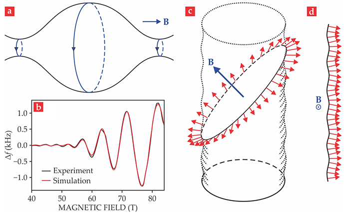 Fermiology. (a) The Fermi surface of a metal lives in so-called k space, with the quasi-momentum k being the conserved quantity that replaces momentum for a particle in a spatially periodic potential. In the presence of a magnetic field B, the closed orbits of electrons define planes perpendicular to B. The orbit frequency, which gives the spacing between energy levels, is proportional to B; increasing the magnitude of B forces those levels to leave the Fermi surface one by one, so the metal’s properties oscillate. Extremal orbits such as the ones shown in color dominate the response. (b) Resistivity oscillates in response to an increasing magnetic field. The experimental measurements (black) used an RF technique in which frequency change (Δf) is proportional to the change in resistivity. The simulated results (red) were obtained using a variant of a formula derived by Ilya Lifshitz and Arnold Kosevich. The beating shows that more than one extremal orbit contributes to the resistivity change. (Adapted from ref.