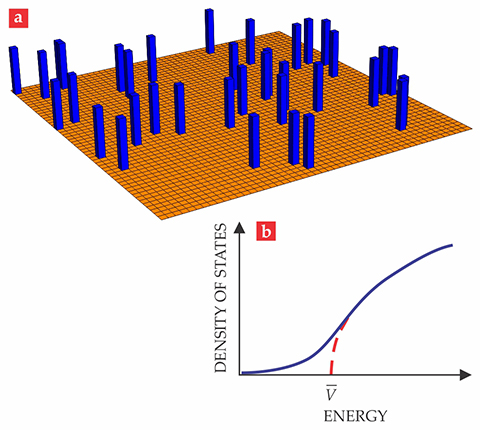 A Lifshitz tail. (a) In a simple model of a disordered crystal, impurities are randomly distributed regions of space in which the potential is