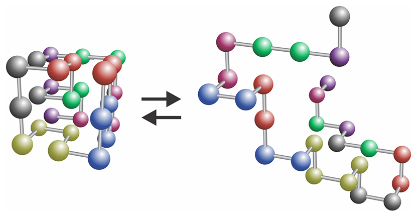 The coil–globule transition. A polymer, here represented in a ball-and-stick model, can transition between a space-filling globule (left) and a fluffy coil (right).