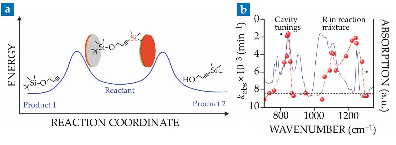 Chemistry experiments under VSC can be run inside microfluidic optical cavities (see opening image) that are tuned to the IR vibrational bands of the solute, the solvent, or both. A simple Fabry–Perot cavity comprises two mirrors that are separated by a thin polymer spacer, typically about 10 µm thick. The cavity’s frequency can be fine-tuned to a given vibrational transition simply by squeezing the spacer with a screwdriver and monitoring the spectrum with a standard Fourier-transform IR spectrophotometer. The two reactions described below illustrate the consequences of VSC on chemistry.