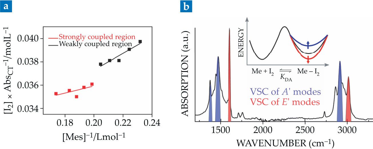 Symmetry and vibrational strong coupling (VSC). (a) The highly symmetric molecule mesitylene can react with iodine through a charge-transfer complexation reaction. A so-called Benesi–Hildebrand plot reflecting the change in the inverse mesitylene concentration versus the charge-transfer complex’s absorption reveals an abrupt shift when the coupling transitions from weak to strong. (b) An IR absorption spectrum of mesitylene shows its vibrational modes. They can be grouped by the symmetry classes they belong to, E’ (red) and A’ (blue). Coupling a cavity to those modes shifts the equilibrium landscape of the mesitylene–I2 complexation process (inset). Under VSC of the E’ modes, the equilibrium constant KDA increases and the complex is favored; VSC of the A’ modes favors the reactants. (Adapted from ref. 6.)
