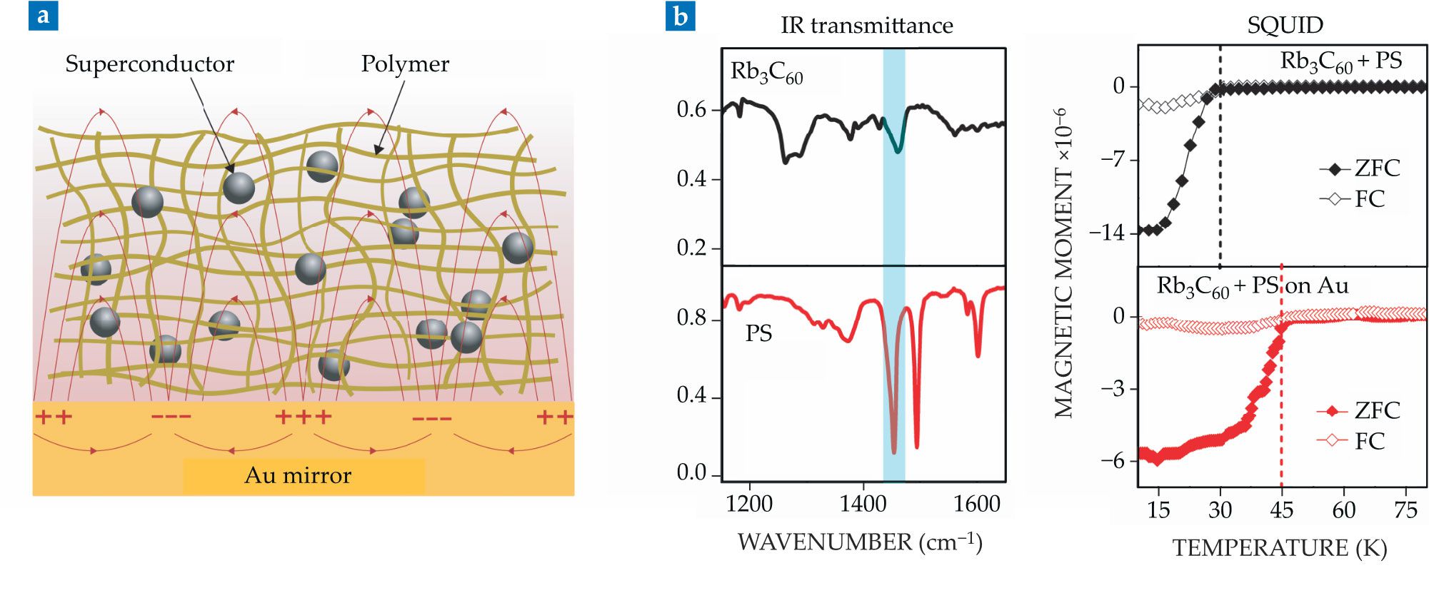 Superconductivity enhanced by plasmons. (a) Coupling the IR absorption band of Rb3C60 nanoparticles to the surface-plasmon modes of a gold mirror can enhance the compound’s superconducting properties. A polymer matrix is needed to mediate the coupling. (b) Although Rb3C60 absorbs only weakly in the IR, polystyrene (PS) has an overlapping vibrational band that absorbs strongly at the same wavelength and facilitates cooperative coupling. Measurements of the polymer–particle complex’s magnetic moment under zero-field-cooled (ZFC) and field-cooled (FC) conditions reveal an increase in the superconductor’s critical temperature with surface-plasmon coupling from 30 K to 45 K, and the gaps between the FC and ZFC curves indicate the Meissner effect. (Adapted from ref. 11.)