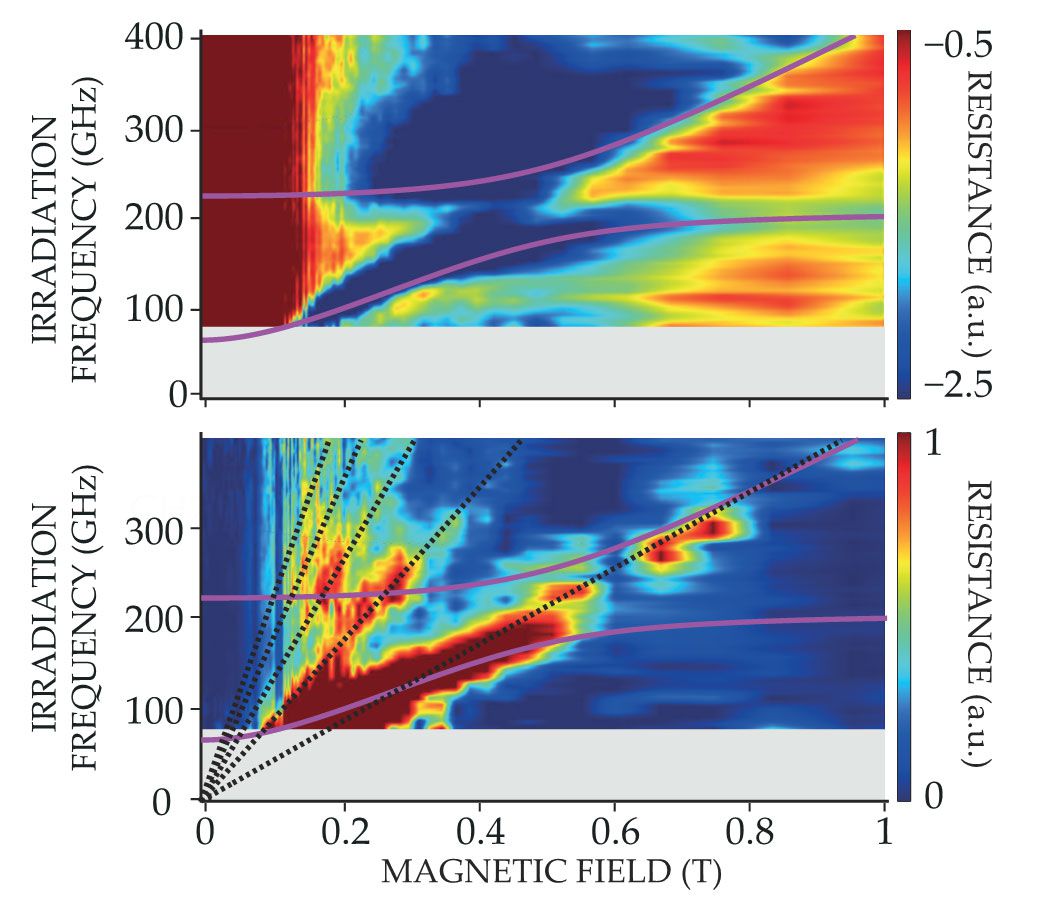 Magneto-transport under weak terahertz illumination. The color plots reveal the change in resistance of a two-dimensional electron gas when probed in the manner illustrated schematically in figure 4. The top graph shows the resistance change for magnetic fields that cause transport to occur in extended states that form polaritons (purple lines). In the lower graph, the Fermi level lies in the localized states that do not participate in the polaritons; the resistance maxima therefore follow the dispersion of the Landau levels (black dashed lines). (Figure adapted from ref. 15.)