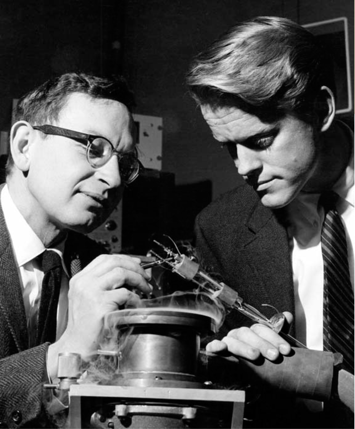 Figure 2. Advanced research once characterized the more prestigious industrial laboratories. In this circa 1964 photo, Philip Anderson (left) and Paul Richards, both then at Bell Labs, inspect the equipment they used to confirm that superfluidity and superconductivity are related.