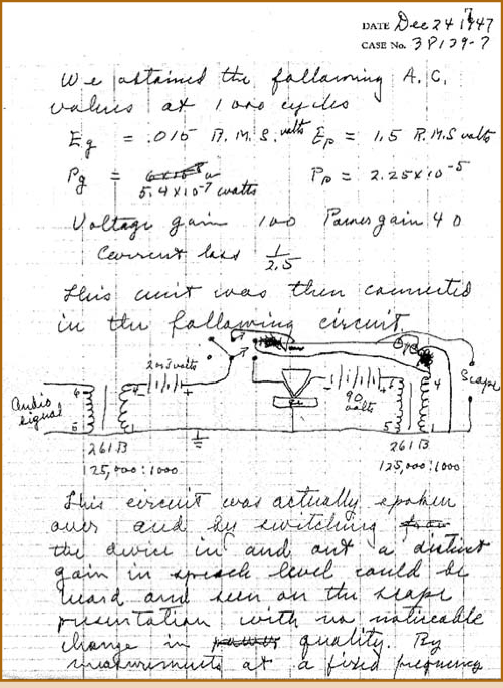 Figure 4. Lab notebooks were once ubiquitous but are now disappearing at many industrial laboratories. This page, from Walter Brattain’s Bell Labs notebook, shows the scientist’s notes regarding the Christmas Eve 1947 breakthrough in developing the first transistor.