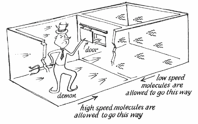 Figure 1. Maxwell’s demon. By detecting the positions and velocities of gas molecules in two neighboring chambers and using that information to time the opening and closing of a trapdoor that separates them, a tiny, intelligent being could, in theory, sort molecules by velocity. By doing so, it could create a temperature difference across the chambers that could be used to perform mechanical work. If the trapdoor is frictionless, the sorting requires no work from the demon himself, in apparent violation of the second law of thermodynamics. (Image from ref.