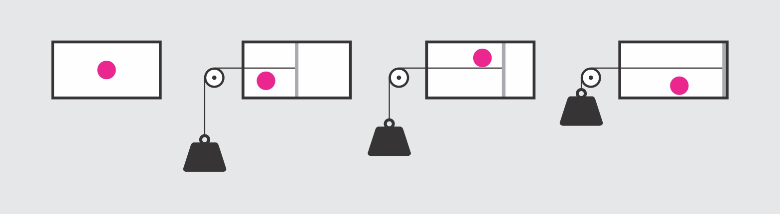 Figure 2. Szilard’s engine. A crafty observer can turn a single particle in a box into an engine that converts information into mechanical work. If, say, the particle is found on the box’s left-hand side, the observer inserts a movable wall and attaches a weight to its left side. The free expansion of the one-particle gas pushes the wall to the right, lifts the weight, and thereby performs work against gravity. (Adapted from ref.