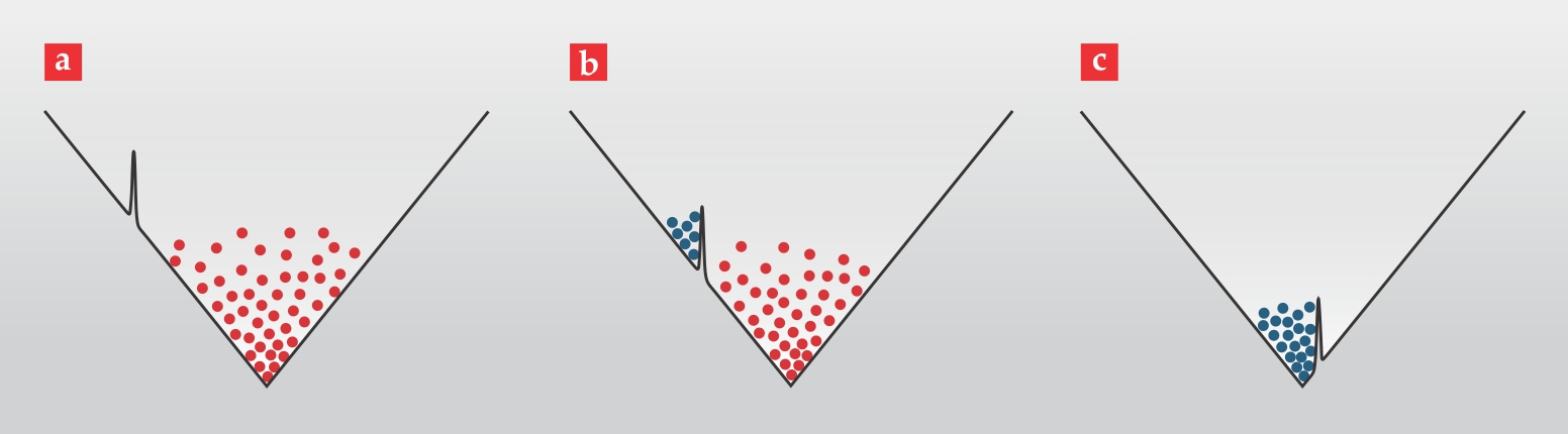 Figure 3. Bringing Maxwell’s demon to life. A pair of laser beams can be tuned to atomic transitions and configured to create a one-way potential barrier; atoms may cross unimpeded in one direction—right to left in this figure—but not in the other. (a) When the barrier is introduced at the periphery of a V-shaped magnetic trap, the atoms that cross the barrier will be those that have converted nearly all their kinetic energy to potential energy—in other words, the cold ones. (b–c) By slowly sweeping the barrier across the trap, one can sort cold atoms (blue) from hot ones (red), reminiscent of James Clerk Maxwell’s famous thought experiment, or cool an entire atomic ensemble. Because the cold atoms do work against the optical barrier as it moves, their kinetic energy remains small even as they return to the deep portion of the potential well. (Adapted from ref.