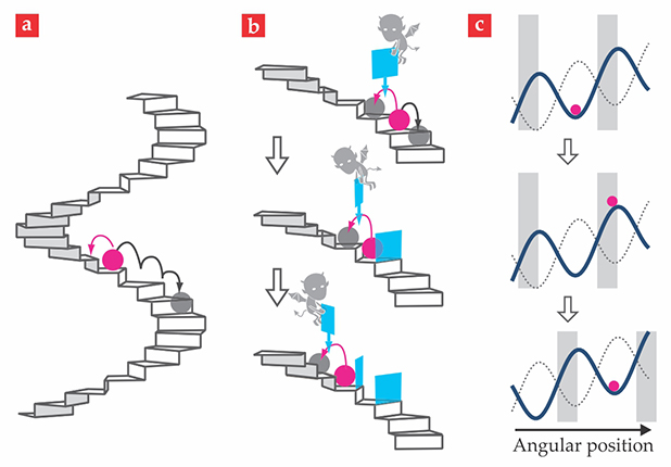In 2010 Masaki Sano’s group at the University of Tokyo realized a Szilard engine with a single, micron-sized colloidal particle bathed in a fluid of uniform temperature. 10 The particle was trapped in a tilted periodic optical potential, which can be schematically understood as a spiral staircase, as shown in figure 4. Driven by thermal fluctuations, a particle moves erratically up and down the staircase. Because the staircase potential is inclined, downward steps are more frequent than upward ones, and the particle will, on average, move downward.