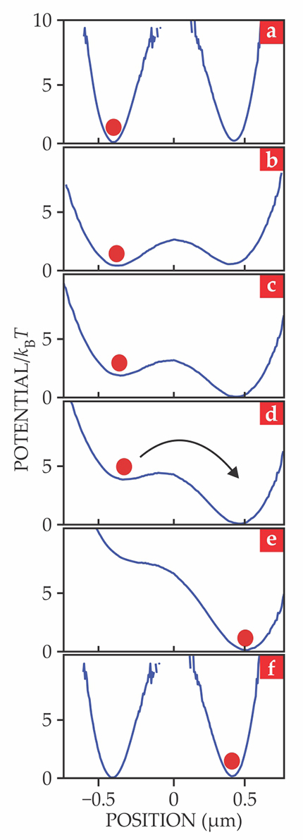Figure 5. Testing Landauer’s erasure principle. A colloidal particle confined with equal probability to one of two optical potential wells constitutes one bit of information. Modulating (a–b), tilting (c–e), and then restoring (f) the barrier between the wells places the particle in the right well with probability close to one, irrespective of the particle’s initial position. The final configuration corresponds to zero bits of information. In the limit of long erasure cycles, the heat dissipated during the erasure process approaches, but does not fall below, kBTln(2), as predicted by Rolf Landauer. (Adapted from ref.