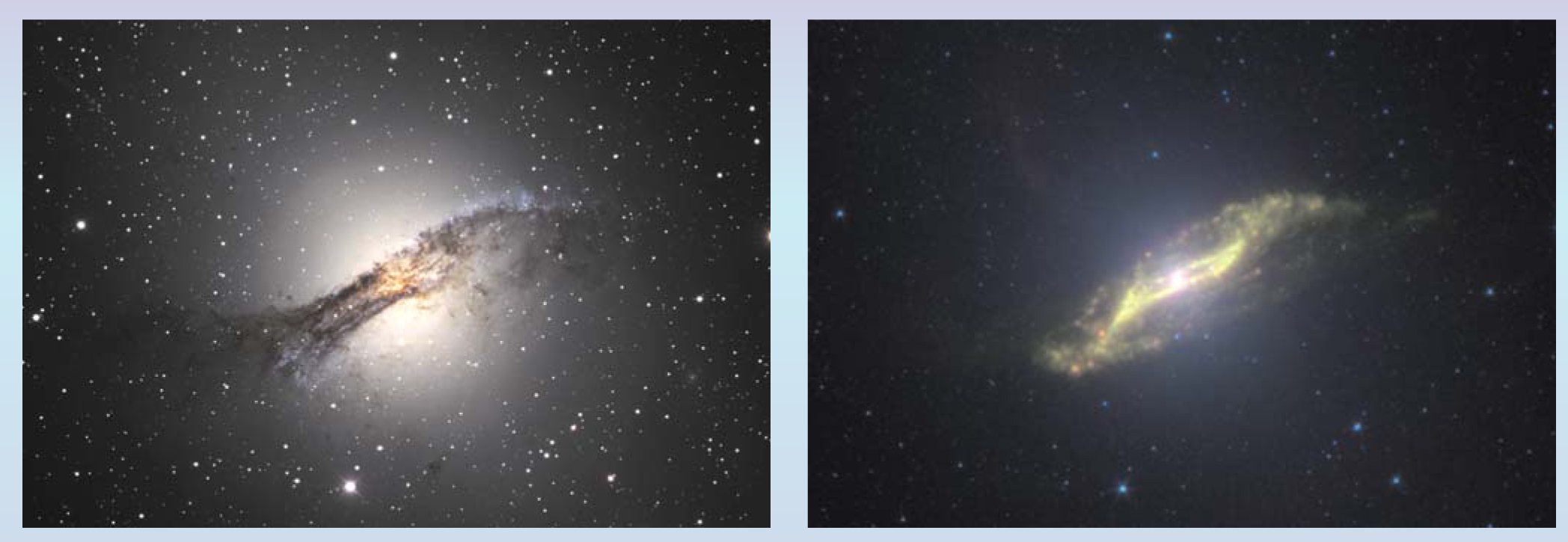 To appreciate the amount of information that the IR band can now provide using modern-day detectors, see figure 1. The multiwavelength IR image from NASA’s Spitzer Space Telescope tells a very interesting story, not revealed in the optical image taken at the Cerro Tololo Inter-American Observatory in Chile. Centarus A is an elliptical galaxy that has apparently captured a smaller spiral galaxy. Simulations show that a disk of interstellar dust and gas freed from the spiral during the collision can become folded and twisted, so as to produce the parallelogram shape seen at the center. Extremely strong radio emission from the center of Centarus A indicates the presence of a supermassive black hole, which may be feeding on the remnants of the spiral. The IR image combines data at wavelengths from 3.6 to 24 μm to emphasize the emission from dust rather than from stars.