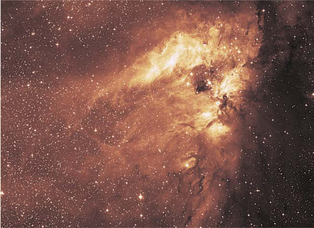 Figure 2. This near-IR image of a region in the nebula M17, dominated by dust and singly ionized hydrogen, was obtained using the University of Hawaii’s 2.2-m telescope through the 1.1–1.4 μm transmission window in Earth’s atmosphere. Hydrogen recombination lines and starlight scattered by dust make up the dominant radiation sources in this region of the sky. The image shows young dust-imbedded stars not readily apparent at visible wavelengths. The 16-megapixel mercury cadmium telluride array is a prototype for the near-IR arrays on the James Webb Space Telescope, scheduled to launch in 2011.7