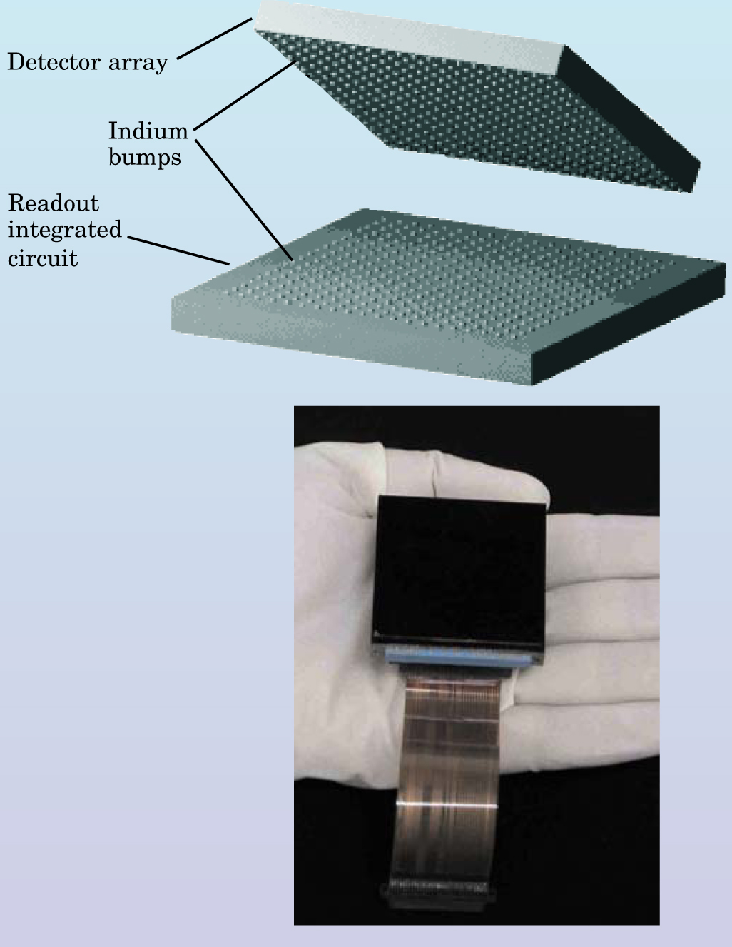 Figure 3. This hybrid array consists of a detector wafer attached to a silicon MOSFET readout multiplexer wafer by an array of indium bump bonds that electrically connects them. Each conducting bump transfers the charge collected from one pixel of the detector to its dedicated amplifier on the readout wafer. That architecture is now standard for IR wavelengths shorter than 40 μm. In the mercury cadmium telluride hybrid package shown, the complete 2048 × 2048 array device is about 40 mm square.