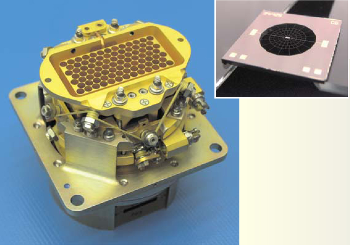 Figure 4. Bolometric focal plane assembly for the SPIRE instrument on the Herschel Space Observatory. The band-pass filter has been removed to show an array of horns that channel light onto a planar array of bolometers similar to the one shown in the inset. A support made of Kevlar braids thermally isolates the entire assembly—filter, horns, and bolometers—so that it can operate at 300 mK. This basic approach is now being scaled to arrays of 103 spider-web transition-edge sensor (TES) bolometers. The spider-web bolometer shown in the inset was developed for cosmic microwave background observations on the Planck Surveyor; the 3.4-mm-diameter web of metallized silicon nitride absorbs millimeter-wavelength photons but has a small cross section for cosmic rays. The doped-germanium chip thermometer at its center is attached by indium bump bonds.