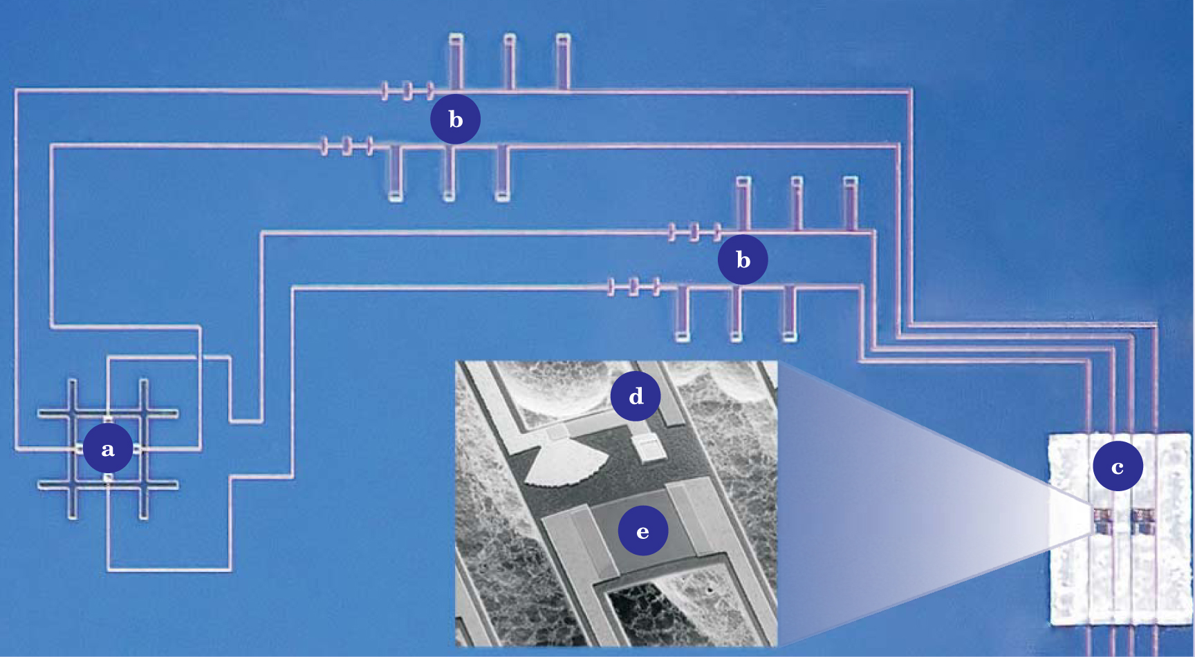 Figure 5. Transition-edge sensor bolometers, designed to measure the polarization anisotropy of the cosmic microwave background. Long used for far-IR heterodyne mixers, superconducting integrated circuits are being developed for arrays of detectors. Etched into the superconducting ground plane, two orthogonal dipole antennas (a) are connected by superconducting microstrip lines through band-pass filters (b) to two TES bolometers (c). In the detailed view of one bolometer, the microstrip lines enter at the top and terminate in a matched resistor (d); leads to the TES thermometer (e) exit along the bolometer legs.