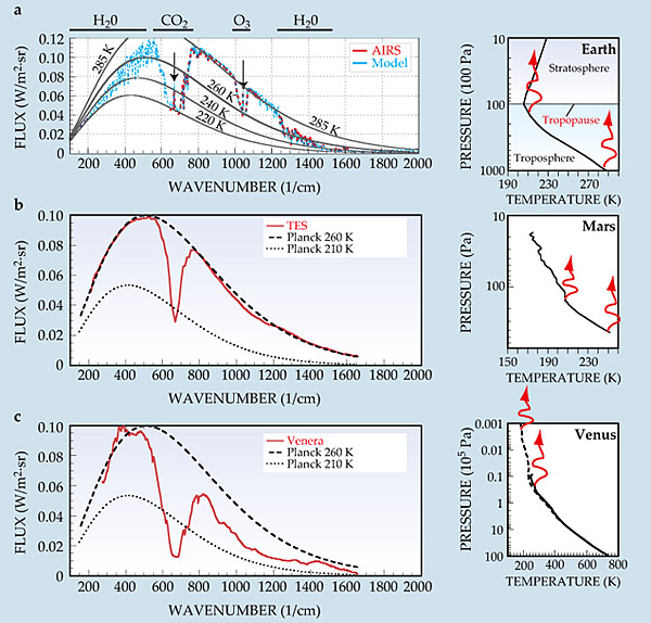 Figure 3. Satellite measurements of emission spectra are not limited to Earth. (a) The left panel compares a computed global-mean, annual-mean emission spectrum for Earth (blue) with observations from the satellite-borne AIRS instrument (red); both are superimposed over a series of Planck distributions. Two arrows point to absorption spikes discussed in the text. The temperature profile to the right, also an annual and global average, is based on in situ measurements. (b) The panel to the left shows a summer-afternoon emission spectrum for Mars observed by the TES instrument on the Mars Global Surveyor. Its accompanying temperature profile was obtained from radio-occultation measurements corresponding to similar conditions. (c) The panels here show a Venusian equatorial night thermal spectrum as measured by the Venera 15 orbiter14 together with a typical temperature profile for the planet. The upper portion (dashed curve) of the temperature sounding is based on radio-occultation observations from the Magellan mission; the lower portion (solid curve) was observed by a Pioneer Venus descender probe. For all three planets, squiggly arrows on the temperature profiles indicate the range of altitudes from which IR escapes to space.