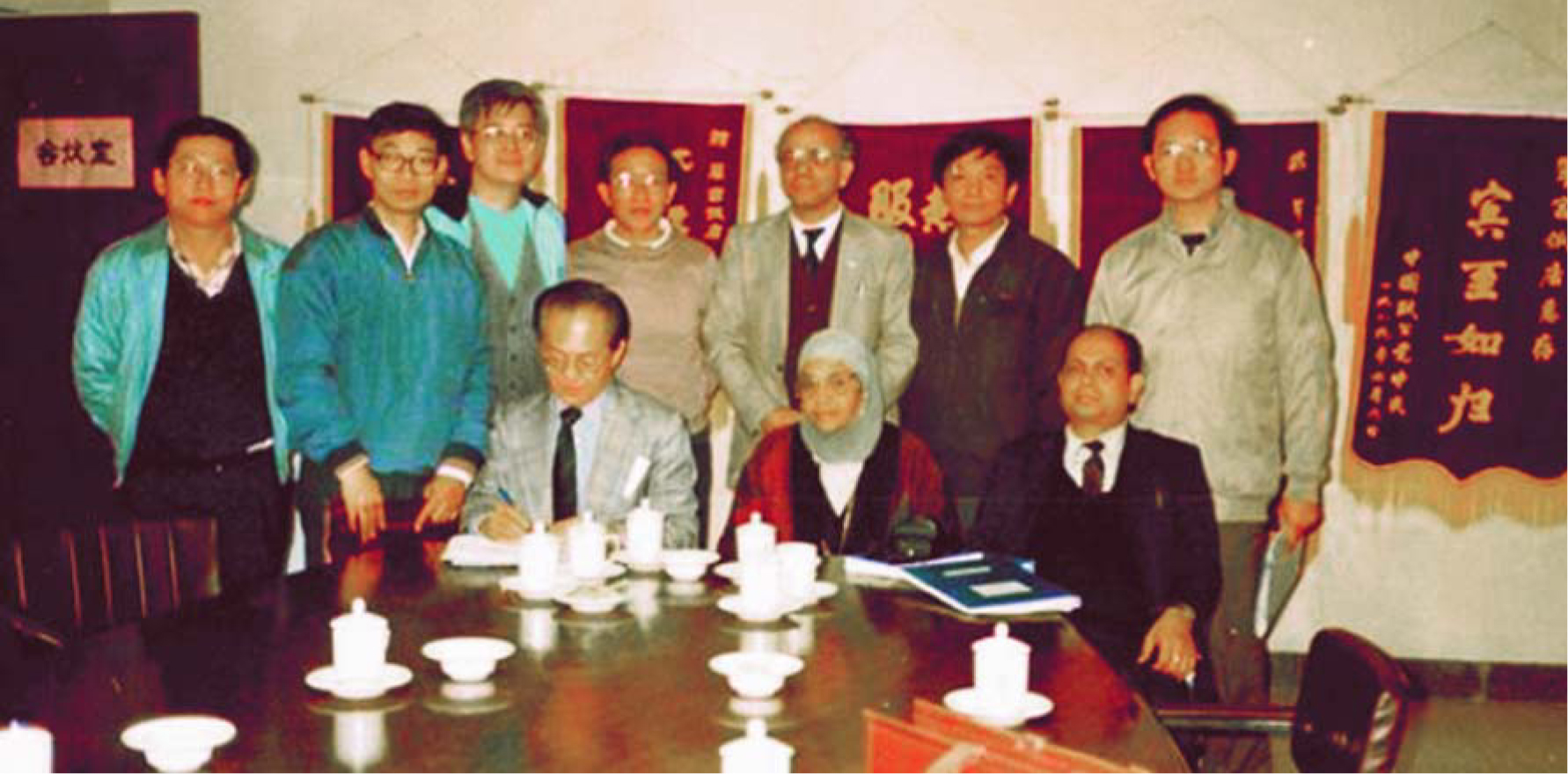 Figure 4. AAAPT council meeting in Beijing, November 1989. From left, seated: Sing Lee (president, Malaysia); Tomader El-Khalafawy (vice president, Egypt); and Mahesh Prasad Srivastava (VP, India). Standing: Chaivitya Silawatshananai (coordinator, Thailand); Shih Tung Tsai (VP, China); Ah Chuan Chew (honorary treasurer, Malaysia); Siew Pheng Moo (VP, Malaysia); Ghulam Murtaza (VP, Pakistan); Yin-an Li (coordinator, China); Chiow San Wong (honorary secretary, Malaysia).