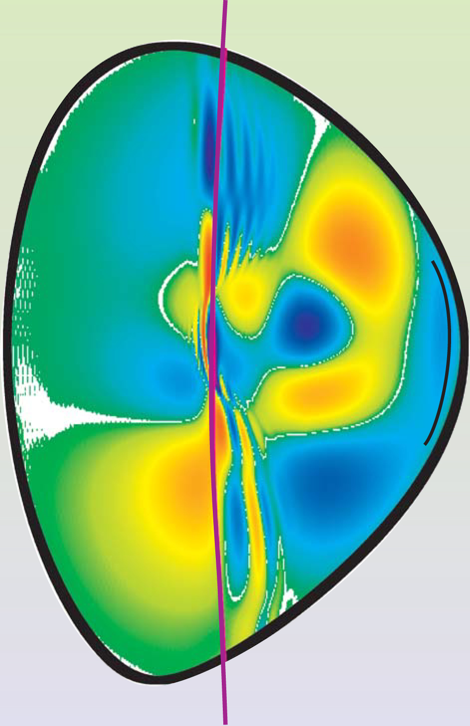 Figure 1. In mode conversion, plasma wavelengths change dramatically. In this simulation, plasma waves introduced by the antenna (visible to the right just inside the conducting boundary) are converted into shorter-wavelength modes near the surface indicated by the purple line. (The part of the nominal surface beyond the conducting boundary is to guide the eye.) Colors indicate the amplitude of an electric-field component: Warm colors are positive, cool colors are negative. The simulated region is about 0.4 m across.