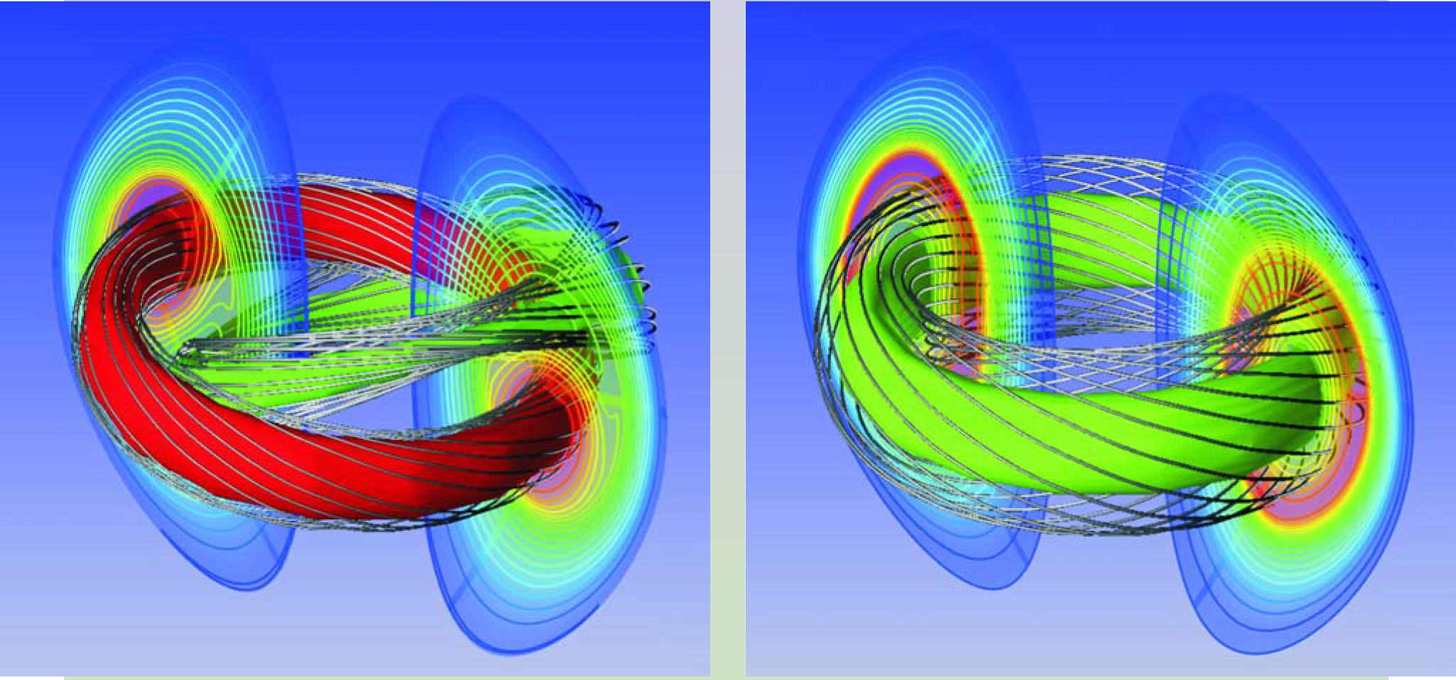 Those coupled, nonlinear, partial-differential equilibrium equations are a challenge to solve, particularly in three dimensions as would be required for an application to stellarators. The pressure’s spatial distribution depends on the shapes of the magnetic flux surfaces, which are not known until the equations are solved. The magnetic field is a combination of external fields generated by coils and the internal field generated by plasma current. The current, in turn, must satisfy the equations, which involve the pressure and magnetic field. In an experiment, the pressure profile will change due to heating and transport, and the current distribution will change in response to the pressure and to external controls. Therefore, calculating the evolution of flux surfaces typically requires many solutions of the equations. As a consequence, calculational algorithms must be fast, accurate, and robust.
