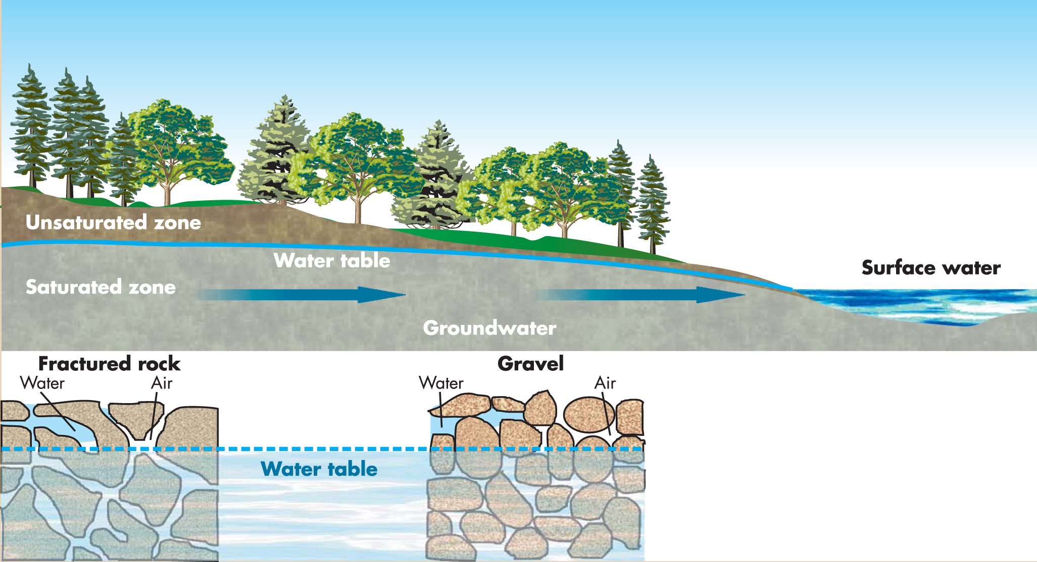 Figure 1. Subsurface water in the unsaturated zone above the water table and in the saturated zone below the water table. Only the water in the saturated zone is considered groundwater.