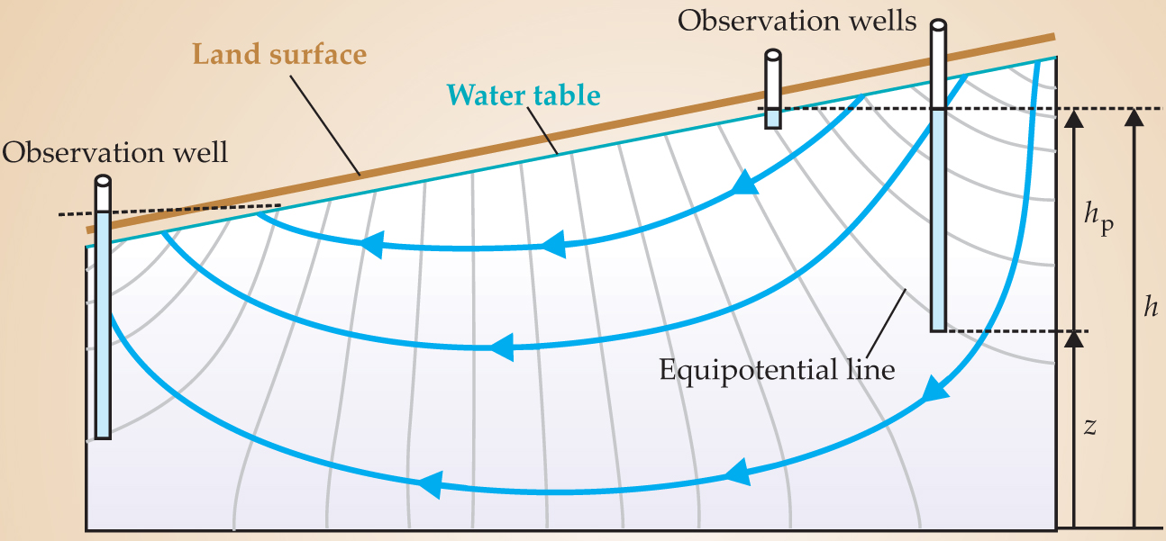 The Darcy’s-law analogue of temperature, electrical potential, and solute concentration is head h, a measure of the potential energy of groundwater. The potential energy per unit mass of groundwater is generally equal to gh, where g is the acceleration due to gravity. Head is the sum of elevation head z, which is a measure of gravitational potential energy, and pressure head h p, which is a measure of potential energy due to pore pressure. Head is measured in the field as the elevation to which the water level rises in an observation well; a three-dimensional array of heads defines a potential field and determines the direction of groundwater flow, as shown in figure 2. Darcy recognized that water flows from higher to lower head, but the realization that head is a potential was not articulated until 1940, when the geophysicist M. King Hubbert published a classic paper on the theory of groundwater flow. Then in 1956 Hubbert showed that Darcy’s law can be derived as a special case of the Navier–Stokes equations. 3