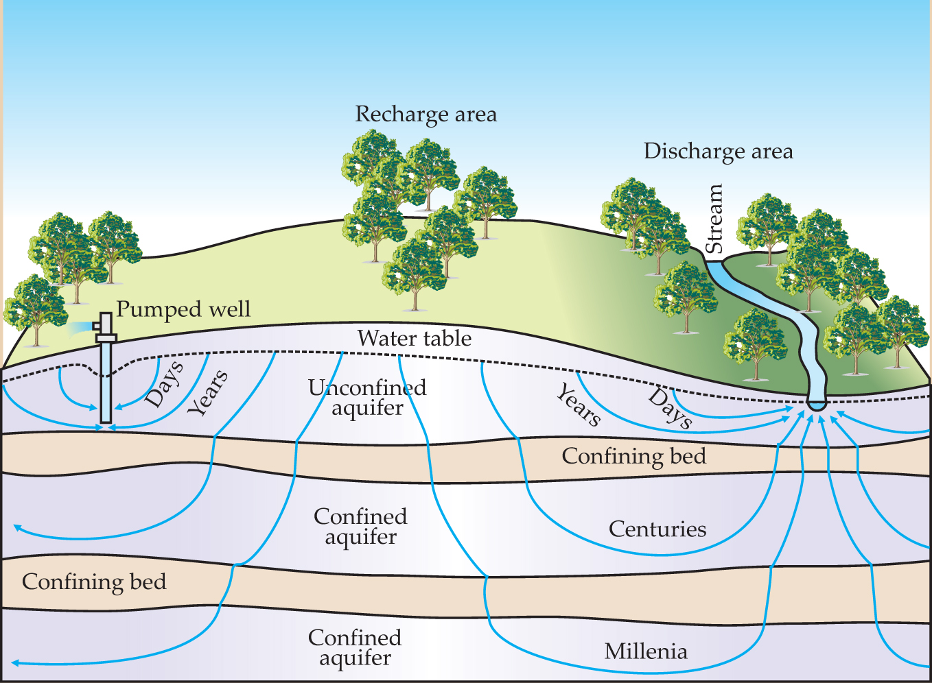 Figure 3. Regional groundwater flow. Flow lines in a regional flow system composed of aquifers and less permeable confining beds. Water infiltrates the water table in the recharge area and leaves the system and enters a stream in the discharge area. Time scales of ground-water flow and drawdown in the water table around a pumped well are also shown.