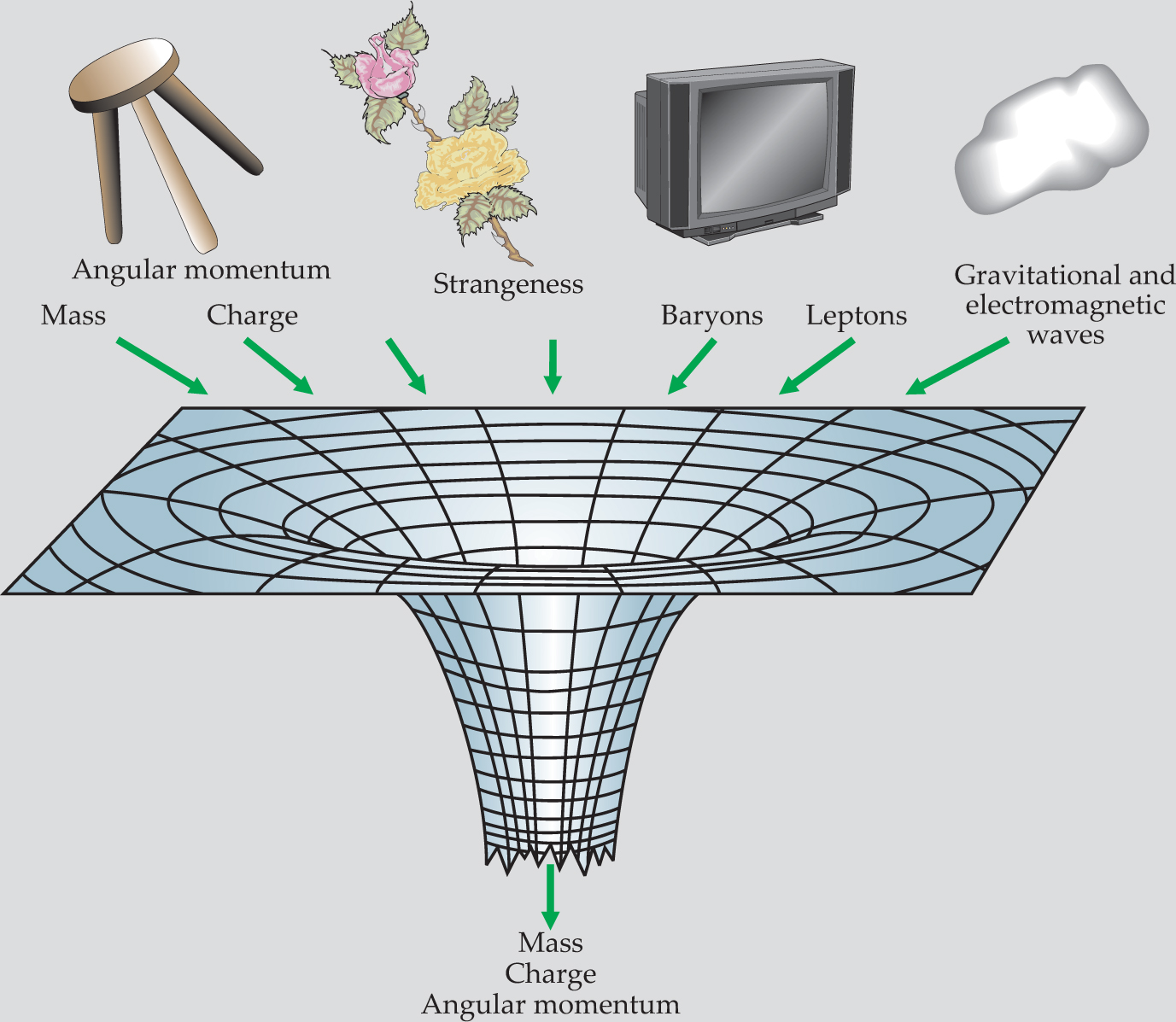 A black hole is what is left behind after an object has undergone complete gravitational collapse. Spacetime is so strongly curved that no light can come out, no matter can be ejected, and no measuring rod can ever survive being put in. Any kind of object that falls into the black hole loses its separate identity, preserving only its mass, charge, angular momentum, and linear momentum (see figure 1). No one has yet found a way to distinguish between two black holes constructed out of the most different kinds of matter if they have the same mass, charge, and angular momentum. Measurement of these three determinants is permitted by their effect on the Kepler orbits of test objects, charged and uncharged, in revolution about the black hole.