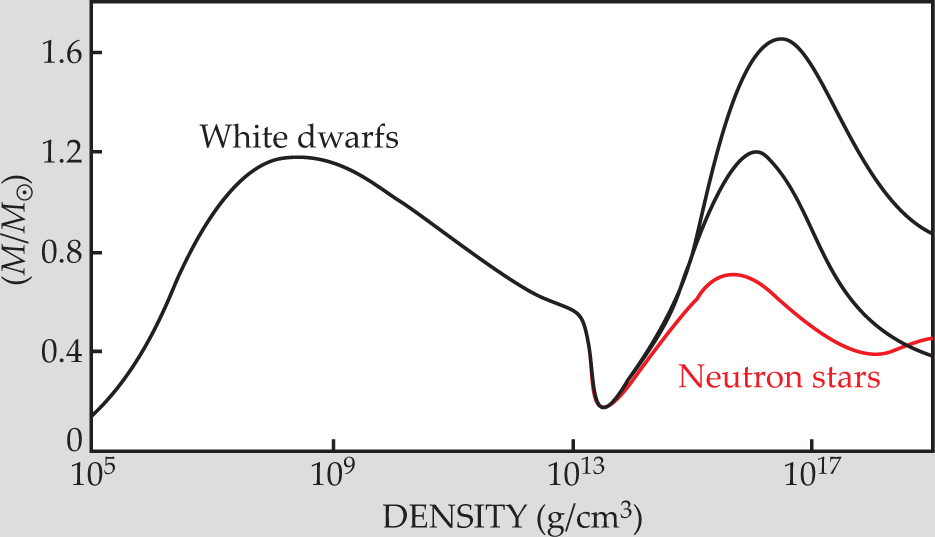 outwards to the point where the pressure drops to zero, we find the total mass corresponding to each value of the central density. The idea that a sufficiently massive star would contract without limit under the influence of its own gravitational field was suggested by study of the white dwarf stars. These are very dense stars in which the pressure arises primarily from a degenerate Fermi gas of electrons. No stable solution exists for a white dwarf with a mass above the Chandrasekhar limit, which is about 1.2 solar masses. What is the endpoint of stellar evolution for a star more massive than this critical mass?