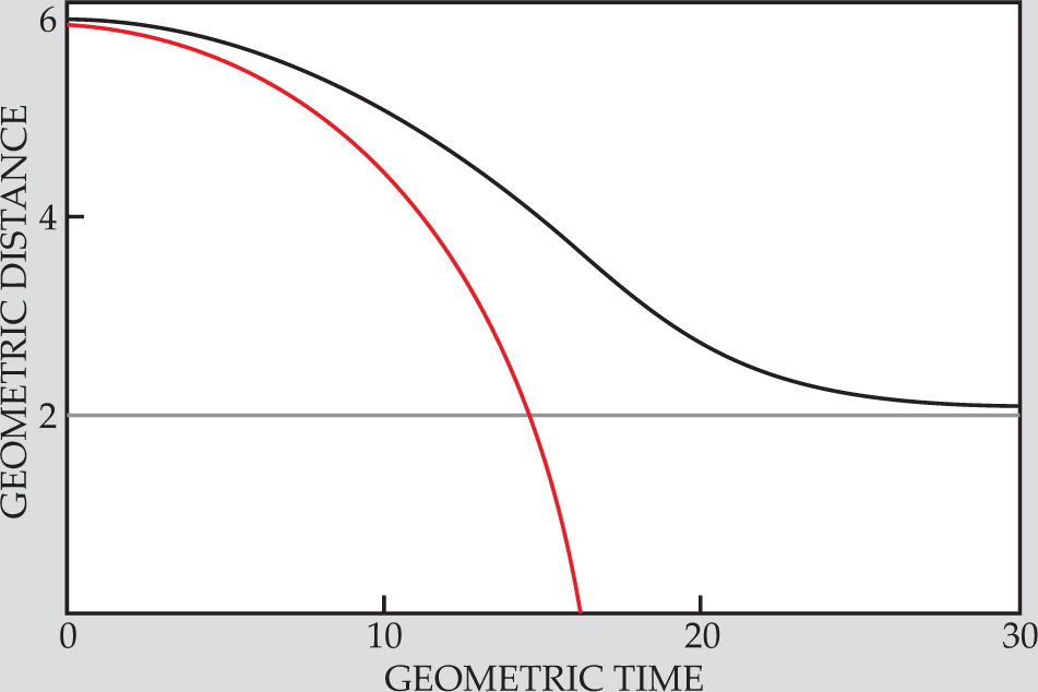 Figure 3. Fall towards a Schwarzschild black hole as seen by a comoving observer (color) and a distant observer (black). The proper time for the free fall to the center is finite, although the approach to the Schwarzschild radius as seen by a distant observer is asymptotic in time. “Geometric distance” and “geometric time” are measured in units of the mass of the black hole.