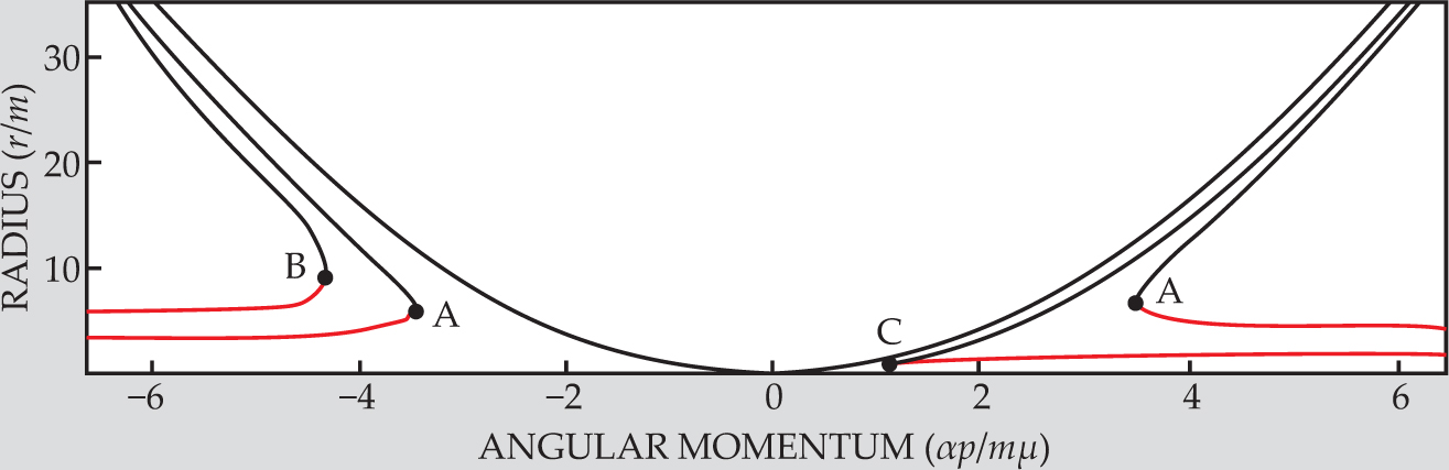 Figure 7. Closest stable circular orbits for the Schwarzschild and Kerr black holes. For Newtonian gravity there are stable orbits of all radii down to zero. The parabola gives the radius of each orbit as a function of angular momentum. For the curved geometries, there are both a minimum (black) and a maximum (color) in the effective potential for each value of the angular momentum down to a critical value below which there is only a point of inflection—hence no stable orbits. A is the minimum Schwarzschild stable orbit; B and C are the minimum stable Kerr orbits for counterrotating and corotating particles, respectively. These results have great significance for the amount of gravitational radiation a particle can emit before falling into a black hole.