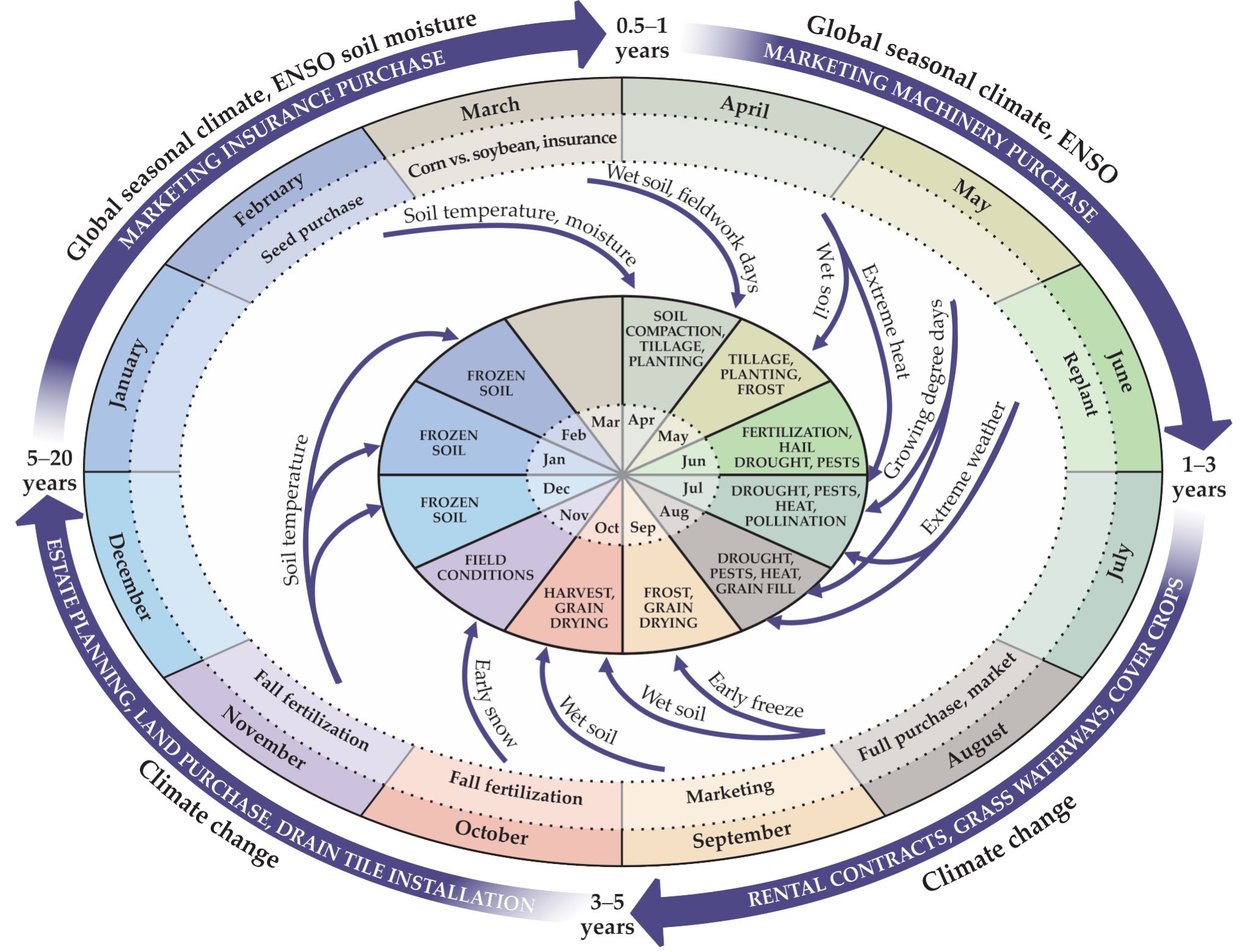 A decision calendar for Midwest corn producers showing climate forecast lead times. The outer monthly ring shows the timing of typical decisions producers make; the inner monthly ring shows the activities and climate outcomes related to those decisions. The lengths of arrows connecting the rings indicate the time lapses, or climate forecast lead times, between decisions and their impacts; the labels on the arrows show the relevant climate condition. The outer ring of arrows indicates decisions farmers make that are affected by seasonal to decadal climate conditions and changes. For instance, producers in Florida might use a six-month forecast of the El Niño/ Southern Oscillation (ENSO) conditions to estimate soil moisture levels over the growing season. Farmers in Iowa might use forecasted decadal trends in growing season precipitation to decide on whether to install subsurface drainage tile. (Adapted from ref.