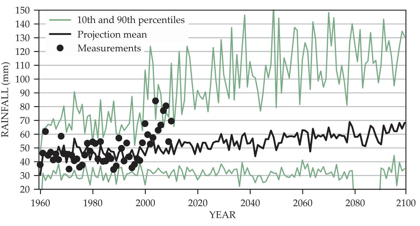 Basin-average annual maximum daily precipitation (AMP) for the Cedar River Basin at US Highway 30 as represented by the average of 19 global climate simulations for the period 1960–2100 and an ensemble of emission scenarios. The black line is model average AMP, and green lines are the 10% and 90% boundaries of AMP. Black dots are measured values from 1960 through 2009. (Adapted from ref.