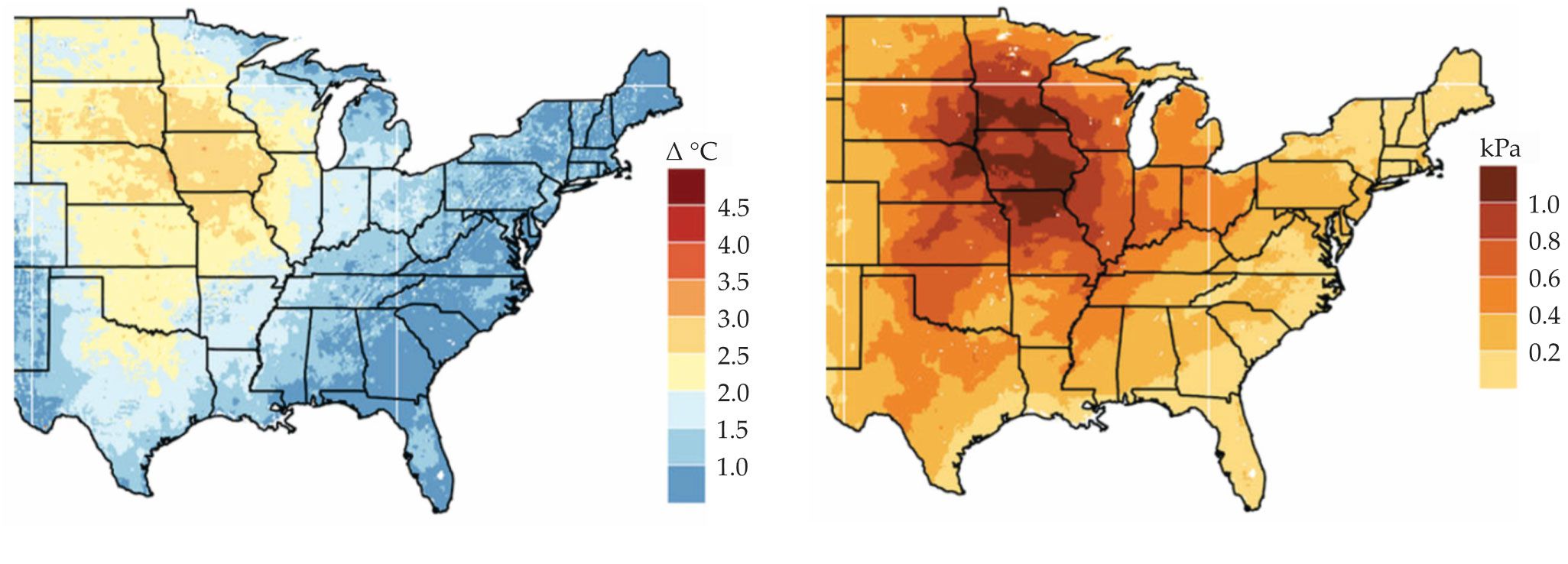 Projected changes in maximum growing-season temperatures (left) and maximum water-vapor-pressure deficit (right) by the end of the 21st century. The changes are downscaled by use of the Weather Research and Forecasting climate model for the medium-carbon-emissions, or RCP 4.5, scenario. (Adapted from ref.