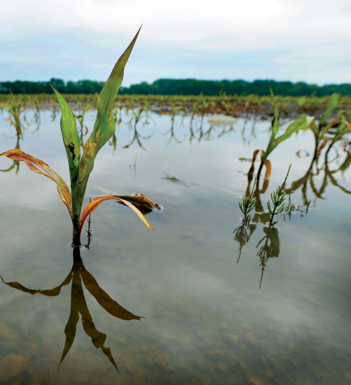 Seed providers have improved the drought tolerance of hybrid corn, but tolerance to extreme heat and waterlogged soil remains elusive. More frequent and intense rain events have left narrower windows for crucial spring fieldwork, so farmers are purchasing larger planters that can be pulled across fields faster. A 90-foot-wide corn planter is currently being marketed in Iowa; it can plant an area the size of a football field in less than 46 seconds, at least doubling the planting speed of two decades ago.