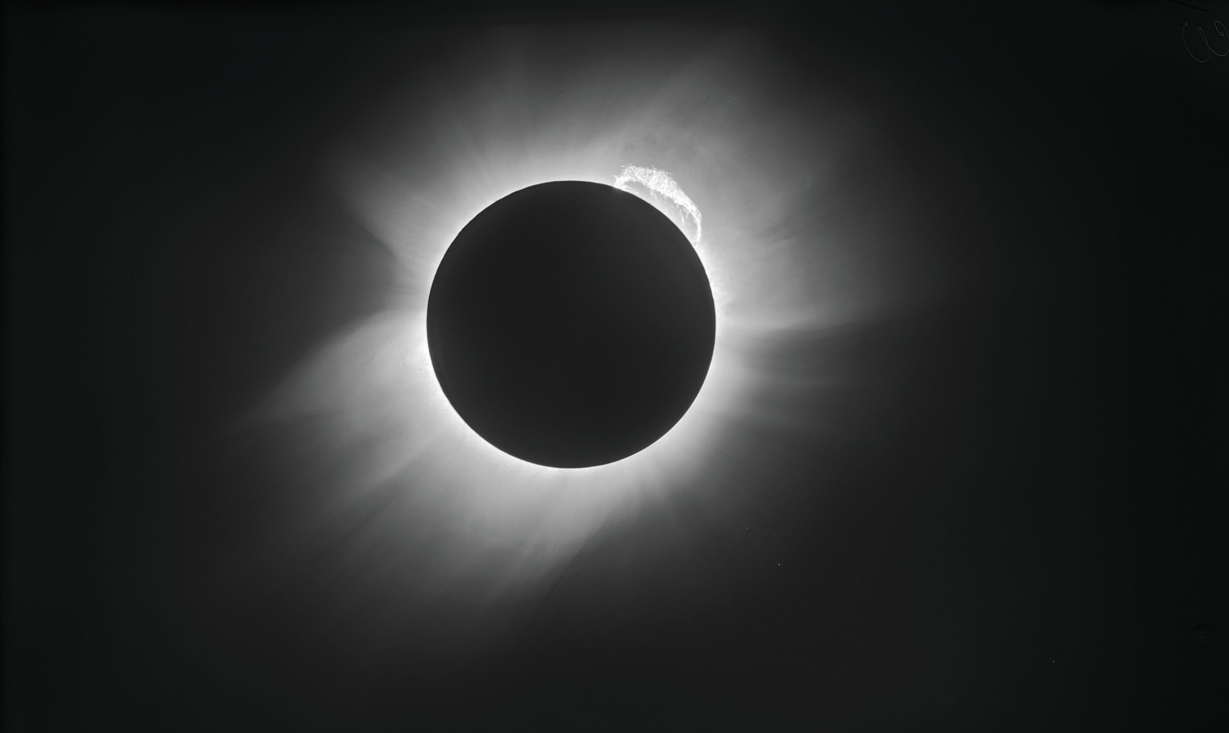 The 1919 solar eclipse provided the first experimental evidence of the theory of general relativity. Using glass photographic plates, Arthur Eddington and Andrew Crommelin imaged the eclipse, as shown here after restoration and modern processing. When stars were close to the Sun—and visible during the eclipse—they appeared displaced due to the bending of light by the Sun’s gravity, as predicted in general relativity. The observation created demand for popular science books explaining the topic. (Courtesy of ESO/ Landessternwarte Heidelberg-Königstuhl/F. W. Dyson, A. S. Eddington, and C. Davidson.)