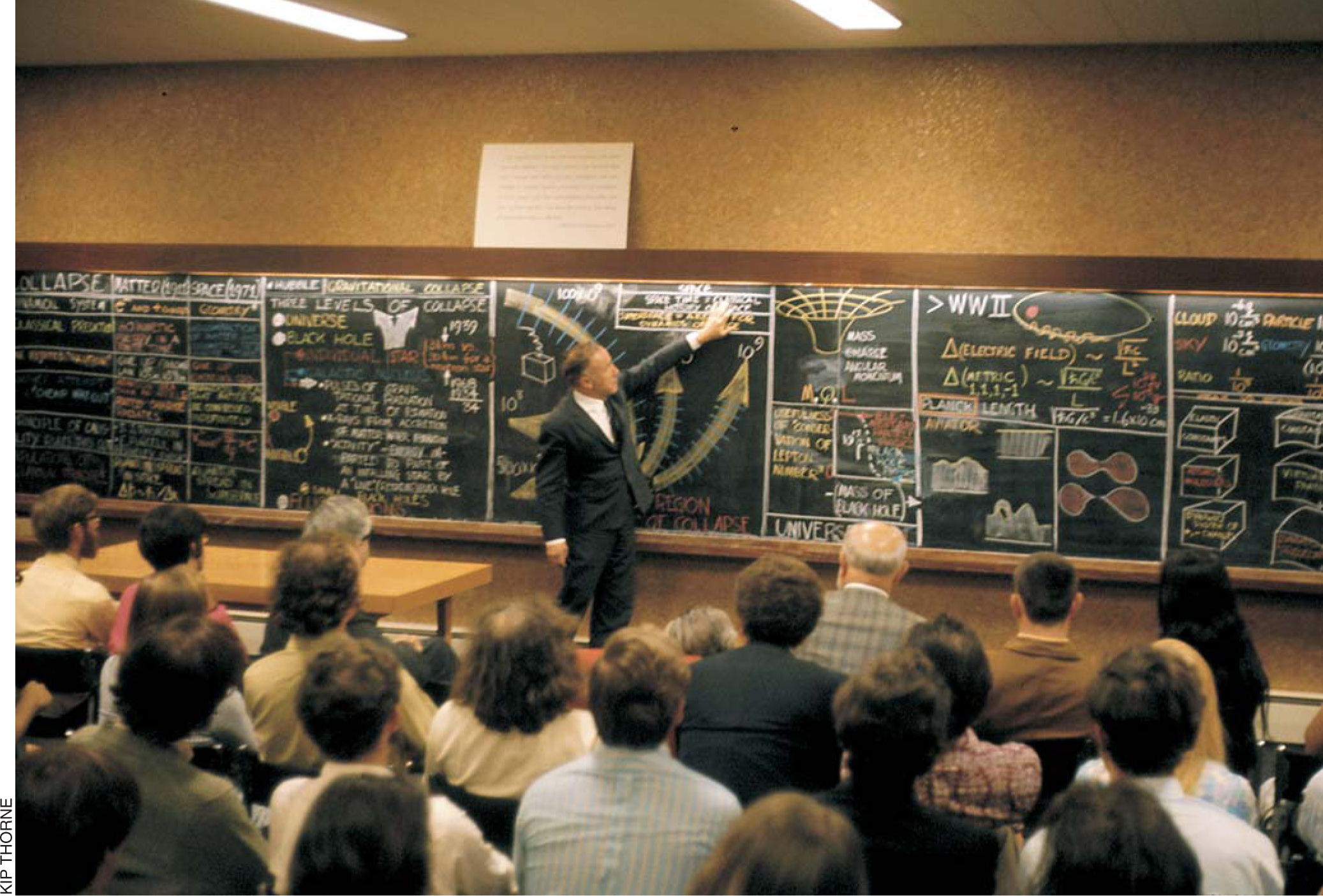 by David Finkelstein (remarkably not a Wheeler student, but in a related collaboration with Misner) and members of Wheeler’s entourage: Martin Kruskal, Misner, and Misner’s undergraduate student David Beckedorff. By 1962 the physical nature of the horizon surrounding a Schwarzschild singularity was clear; Wheeler was convinced that Oppenheimer had been right, and he began urging his students to seek deeper insights into that strange horizon-endowed singularity—an object that he would rename black hole in 1968 (box 1).