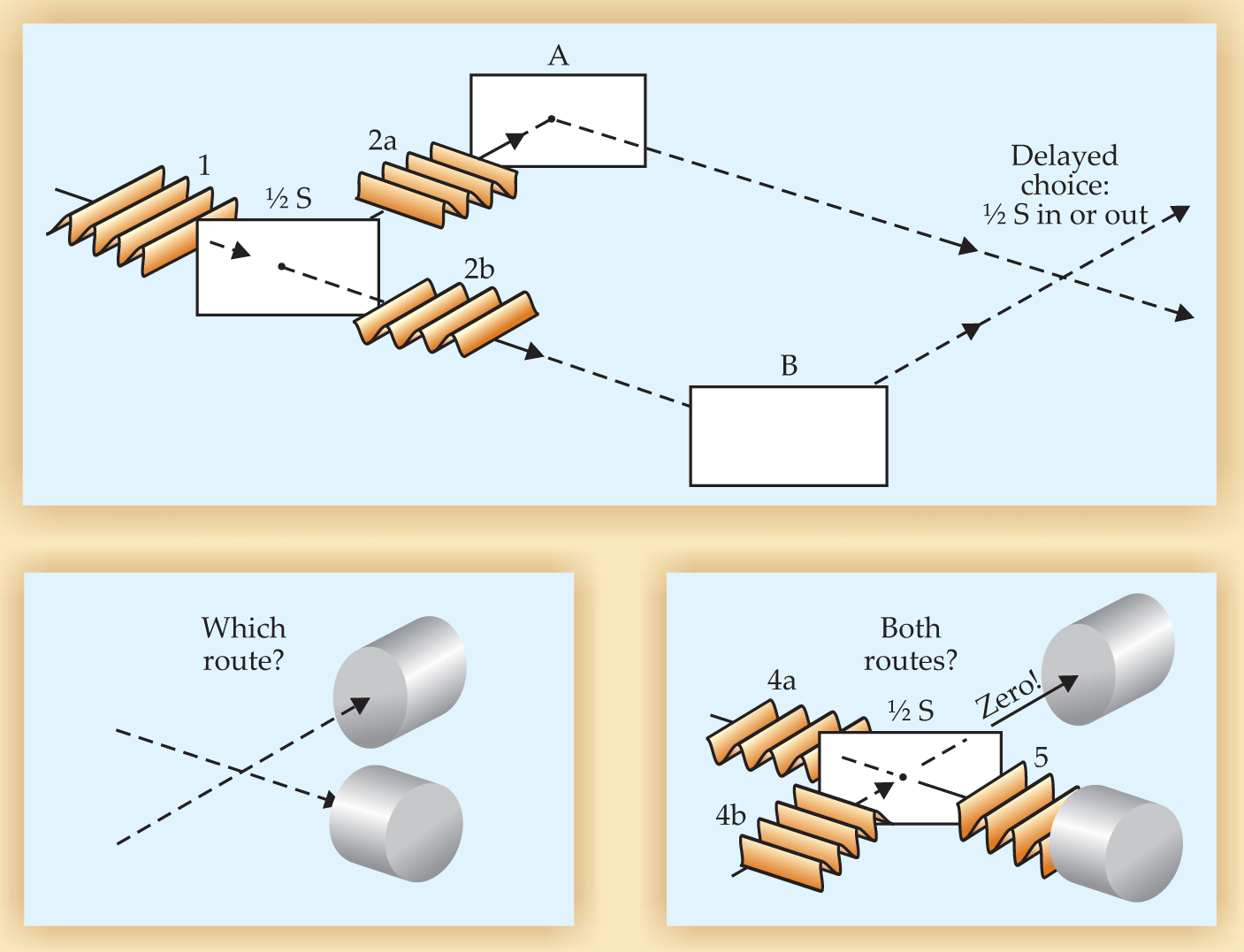 Figure 2. John Wheeler’s original, conceptual version of the delayed-choice experiment (from ref. 16, page 183). Upper diagram: A wavepacket of light, 1, containing a single photon passes through a half-silvered mirror and gets split into two wavepackets, 2a and 2b, that reflect off mirrors and then intersect. After the packet is split in two, an observer–participator decides whether to insert another half-silvered mirror at the intersection point. Lower diagrams: If the mirror is not inserted (left), then the photon behaves like a particle—it goes into either the upper or the lower photodetector, revealing which path it took. If the mirror is inserted (right), the two wavepackets interfere at the splitter—the photon behaves like a wave—with destructive interference toward the upper photodetector, constructive toward the lower (wavepacket 5). The observer–participator’s decision, made after the wavepacket is split in two, determines whether it will behave like a particle or a wave.