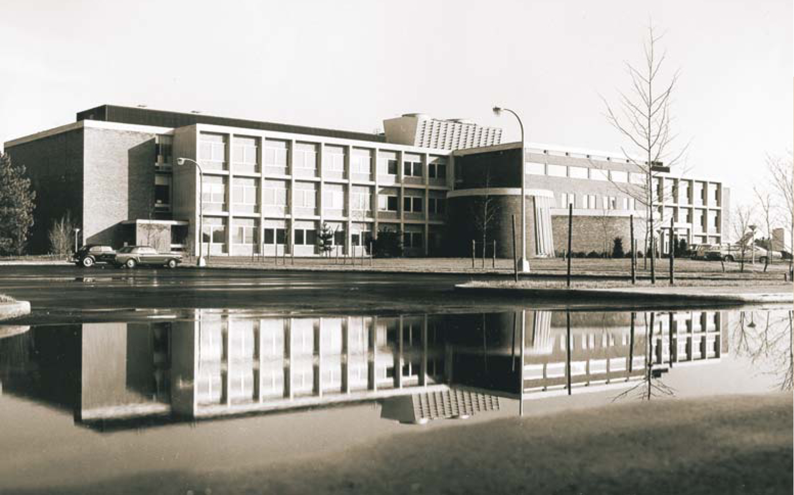 Instead of Murray Hill’s extended H shape, Saarinen designed Holmdel as a set of four identical 700 × 135 foot (215 × 40 meter) rectangular blocks. Each one was six stories high when the basement and its service facilities were included. A vast interior courtyard connected the blocks, each intended to accommodate 1000 scientists, engineers, and support staff: what management considered a “university-sized unit.” The main corridors ran around the outsides and in-sides of the blocks, interior aisles ran through the main halls, and labs and offices occupied each side of the aisles. Researchers had easy access to their own laboratories but little opportunity to see anyone in neighboring aisles, much less in other blocks, except in the great atrium. Holmdel’s distinguishing architectural feature was its glass facade, five stories of 6 × 3 foot panes of reflecting panels. Touted as the biggest mirror ever, it dissolved into the sky and landscape by day and brought the interior into striking relief at night. From the exterior corridors, scientists could draw inspiration from a landscape worthy of Versailles itself—hundreds of acres planted in thousands of varieties of trees and shrubs and crowned with a 6-acre reflecting and cooling pool (to the right in figure 1) with fountains and a unique water tower modeled on an early transistor.