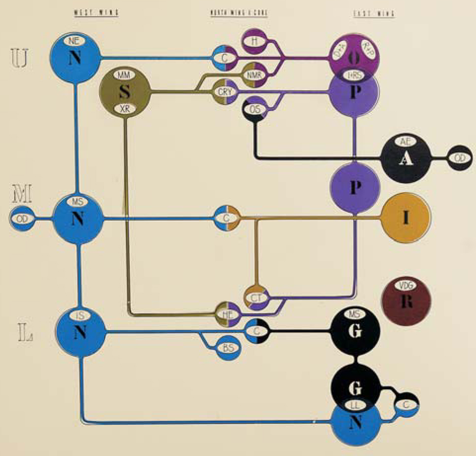 Figure 4. Before designing the new chemistry building at Brookhaven National Laboratory, Marcel Breuer and his assistant Robert Gatje interviewed the chemists at the lab and observed them at work. As a result of that study, they created this graph, which relates chemists of various subdisciplines to each other and to the equipment they use.