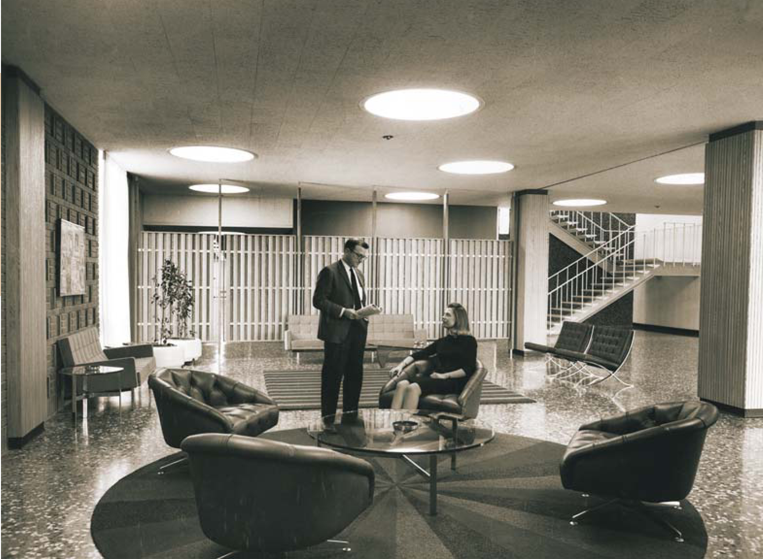 Figure 5. The stylish lobby of Building 555 boasted furniture by prestigious designers, paneled walls, and a striking stairway. Standing in this 1967 photo is Jerome Hudis, who chaired the lab’s chemistry department from 1977 to 1981. Seated is chemist Eena-Mai Franz.